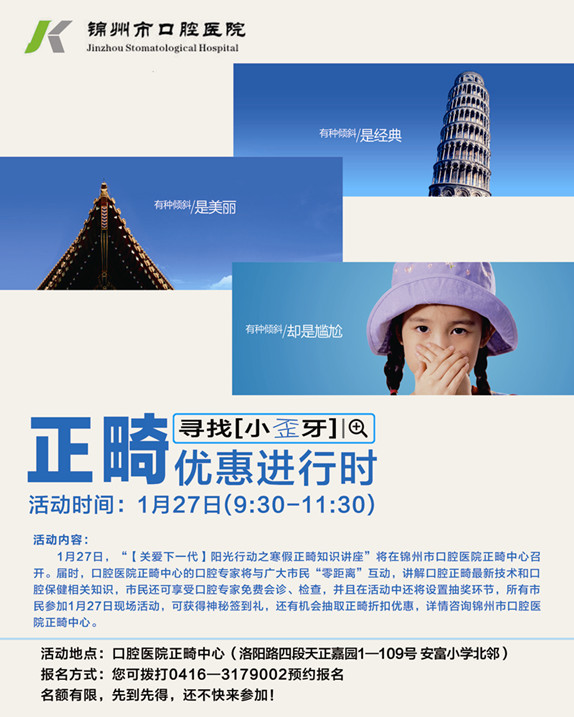 本著回饋社會(huì)及關(guān)愛(ài)青少年健康成長(zhǎng)的宗旨,1月27日,“【關(guān)愛(ài)下一代】陽(yáng)光行動(dòng)之寒假正畸知識(shí)講座”將在錦州市口腔醫(yī)院正畸中心舉行。屆時(shí),口腔醫(yī)院正畸中心的口腔專(zhuān)家將與廣大市民“零距離”互動(dòng),講解口腔正畸最新技術(shù)和口腔保健相關(guān)知識(shí),市民還可享受口腔專(zhuān)家免費(fèi)會(huì)診、檢查,并且在活動(dòng)中還將設(shè)置抽獎(jiǎng)環(huán)節(jié)。所有參加1月27日現(xiàn)場(chǎng)活動(dòng)的市民,均可獲得神秘簽到禮,還有機(jī)會(huì)抽取正畸折扣優(yōu)惠。詳情咨詢(xún)錦州市口腔醫(yī)院正畸中心。
